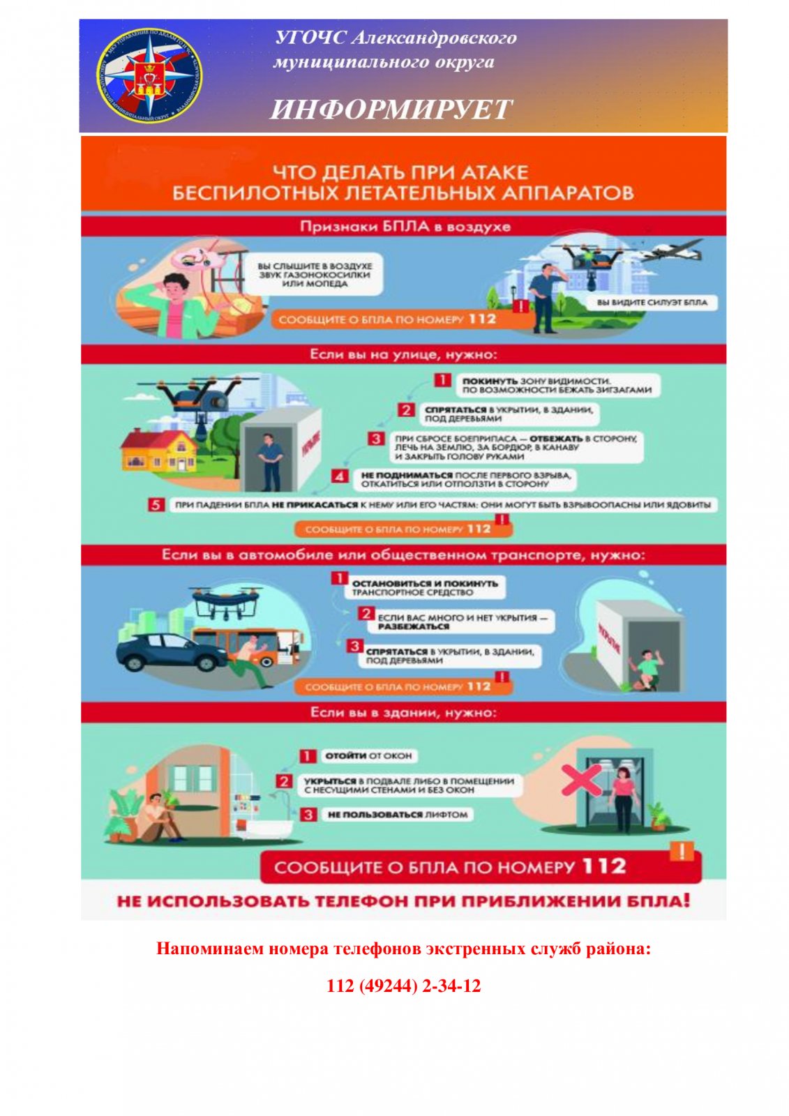 - обеспечить любым доступным способом информирование работников образовательной организации об опасности (подача затяжного или нескольких звонков, либо по средствам речевого или звукового оповещения); - принять решение об изменении порядка образовательного процесса (отменить занятия в школе, прервать «тихий час», прогулку в детском саду…); - обеспечить размещение в безопасном месте (подальше от окон) обучающихся и работников; - выставить посты наблюдения по периметру учреждения с устойчивой связью для мониторинга воздушного пространства на предмет подлетающих БПЛА; - ожидать сообщения об отмене опасности в здании образовательного учреждения; - при отмене угрозы опасности дать указание об информировании родителей (законных представителей) о временном прекращении учебного процесса; - действовать по ситуации: направить к месту сбора назначенных лиц для осуществления контроля за передачей обучающихся родителям (законным представителям) или возобновить учебный процесс